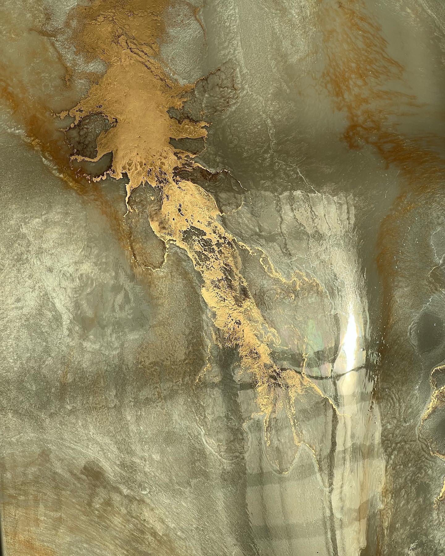 A final coat of resin seals the surface, adding reflection, permanence, and a seamless, glass-like finish. The process demands care and patience—controlled environment, ventilation, and time. Through weeks of layering, curing, and gilding, each work attains its luminous depth and living light.