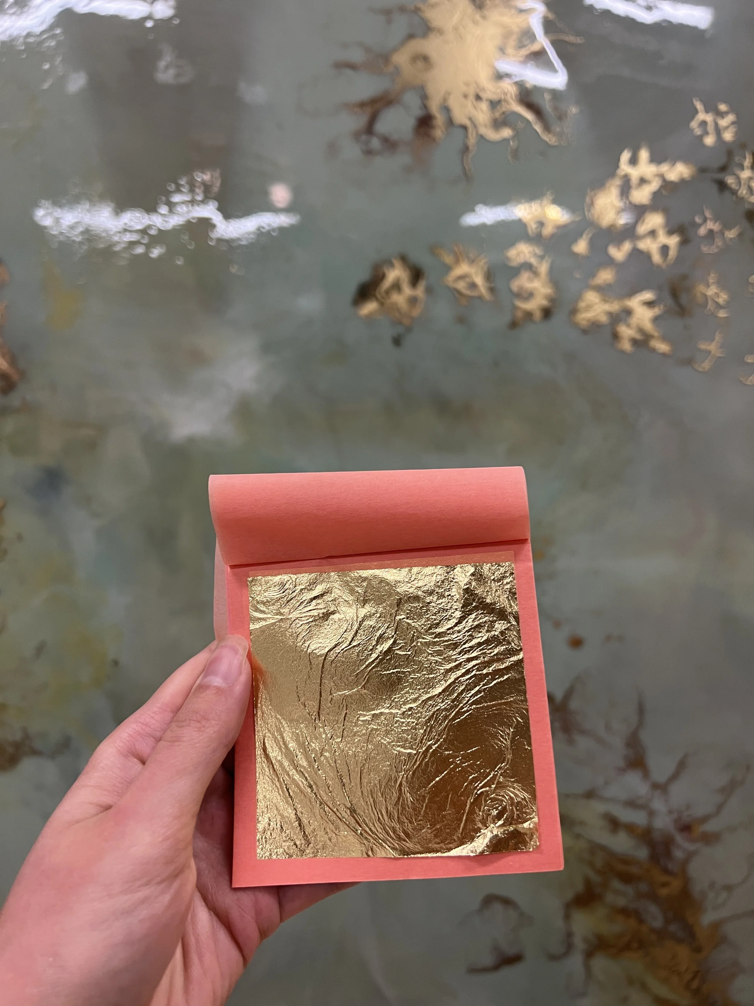 Resin, pigment, and gold leaf are layered through repeated pours — each cured and sealed to preserve movement and light. As each layer cures over 48–72 hours, 24k gold leaf may be applied and gilded by hand to build depth and dimensionality within the surface — sometimes in abstract formations, other times in defined shapes, depending on the composition.