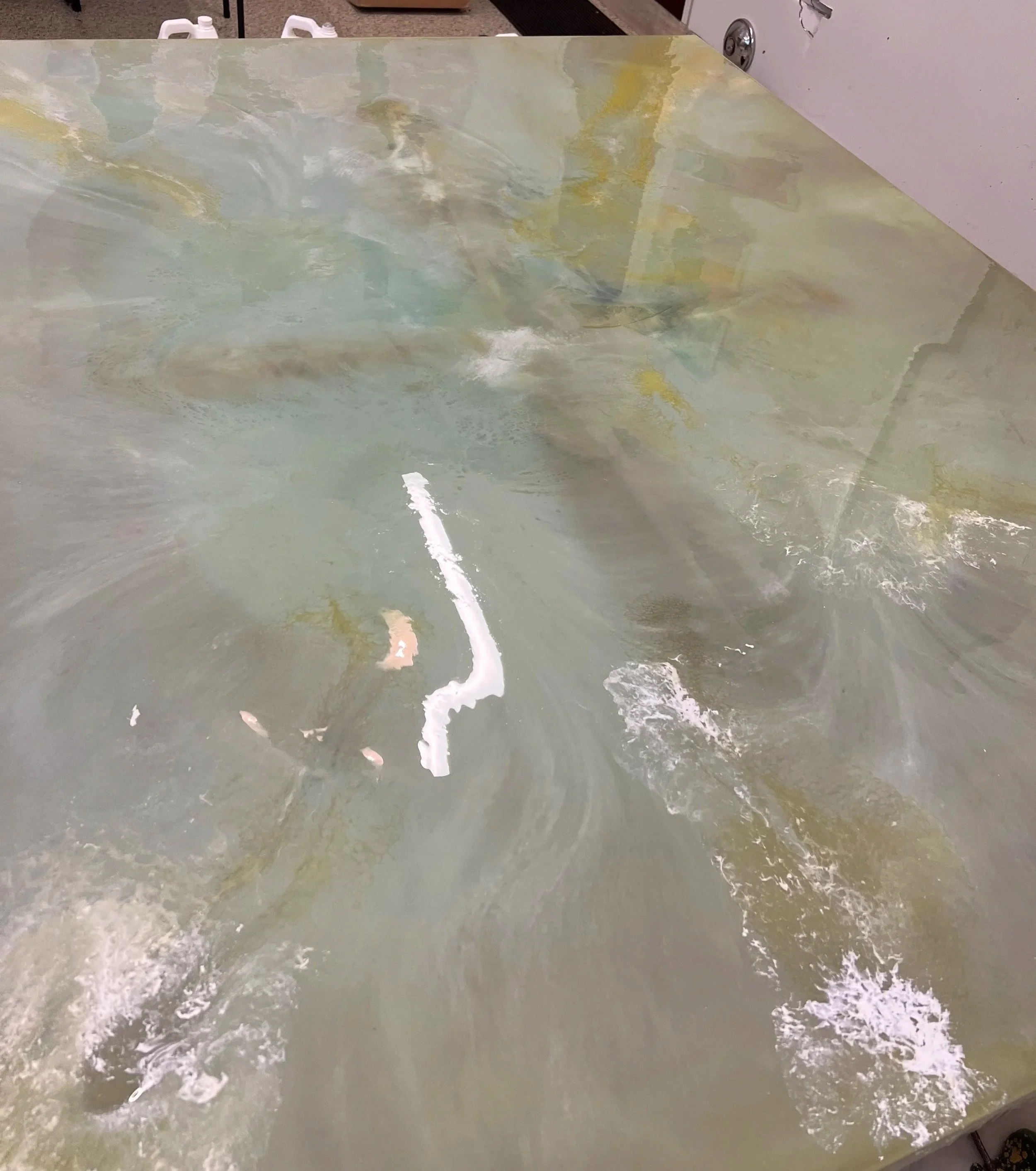 I begin each piece with a clear vision and a planned color palette, simultaneously holding that plan loosely. Resin has its own movement — it flows and settles in ways that cannot be fully predicted or controlled. I attempt to guide it, but the final work rarely looks as I first imagined. That spontaneous unpredictability is what makes God’s Spirit within it alive.